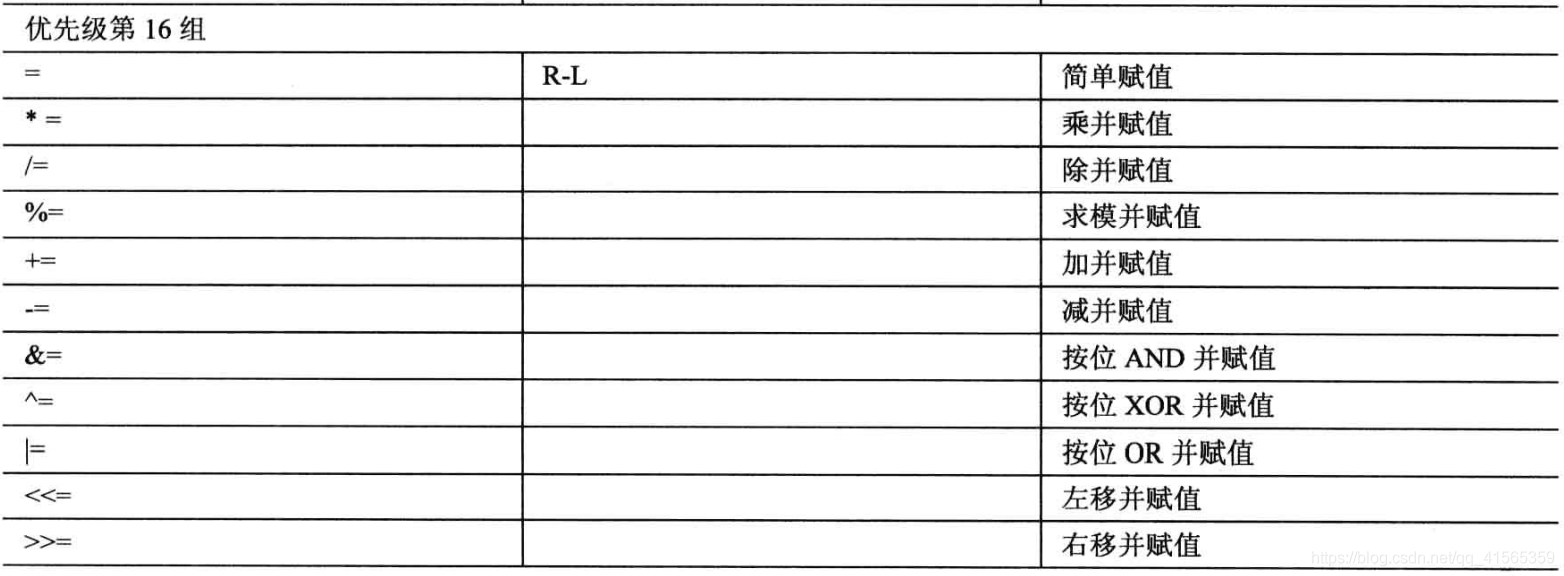 C++一共有 18 个优先级,运算中按优先级进行性计算,当优先级相同时,根据结合性规则来决定。 结合性: 1.从左到右(L-R):操作数和操作符结合的顺序大部分是从左到右结合性的,例如()、单独的算术运算符 2.从右到左(R-L):最典型的是赋值运算符,当赋值符号与算术运算符结合后 ,整体也是 R-L。另一个最常用的就是逻辑非运算符 “!”。